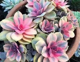 紫珍珠是景天科石莲花属的多年生肉质草本植物。植株中小型;叶片肉质,匙形,呈莲座状紧密排列;叶片粉紫色,…