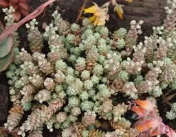 叶子表面宽厚,富肉质感且带有磨纱质感,看像石头质地;开红色小花,生于植株顶部,倒伞形密生,形状像花…
