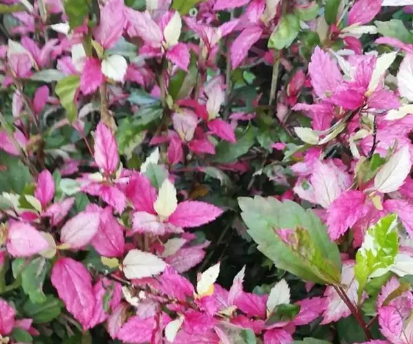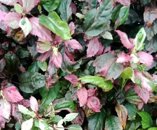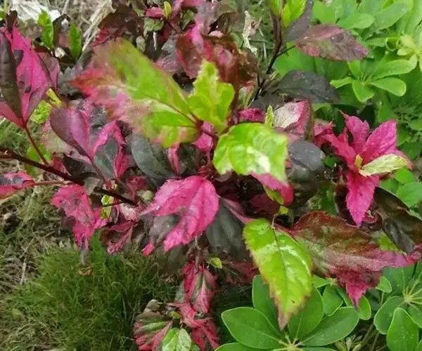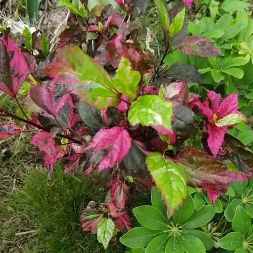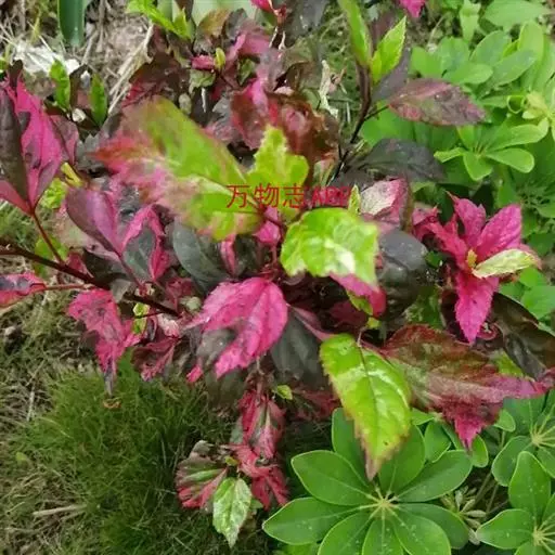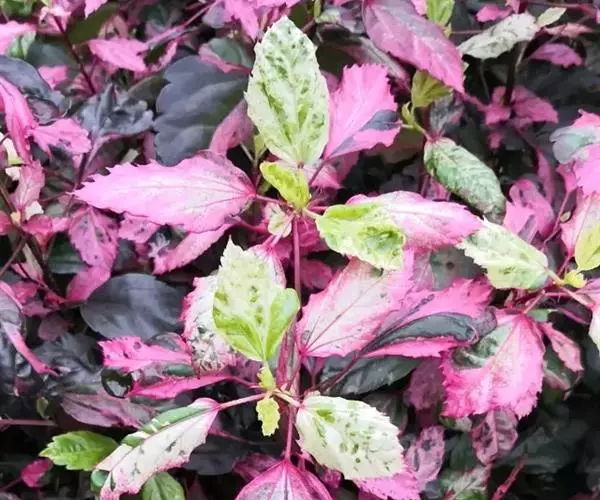 扶桑的栽培品种锦叶扶桑(Hibiscus rosa-sinensis cv.Cooperi.)又名锦叶大红花,以观叶为主,叶子色彩有白、红、黄、绿等斑纹变化,十分美丽。