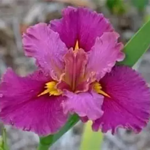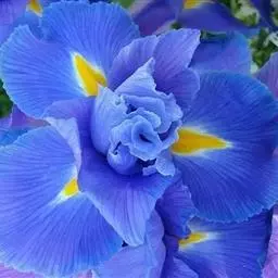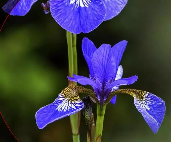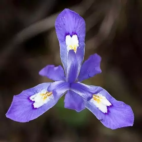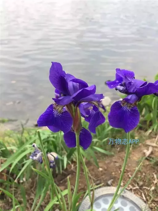 花茎高40-50厘米,实心,具1-2枚茎生叶;苞片3,披针形,长约7厘米,绿色,膜质,先端渐尖;花2-3朵,蓝色,直径6-7厘米,花被管长约1厘米,花被片6,2轮排列,外花被片倒卵形,长约5厘米,宽约1厘米,基部有黑褐色的网纹及黄色斑纹,爪部楔形,无附属物,内花被裂片3,狭倒卵形,长约4厘米,宽约1.5厘米;雄蕊长约3厘米,花丝白色,具黄色花药,花柱分枝扁平,花瓣状,长约3.5厘米,先端裂片三角形,有细齿;子房三棱状柱形。