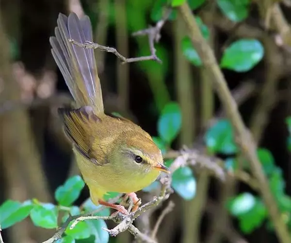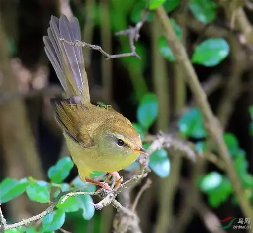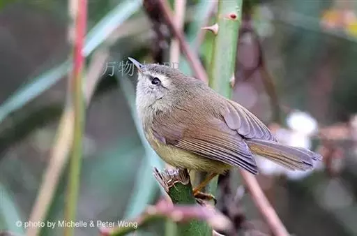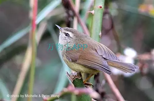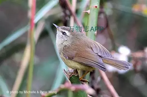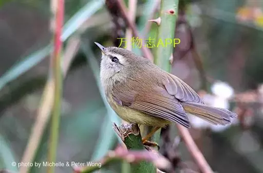 黄腹树莺(学名:Horornis acanthizoides):小型鸟类,体长10-11厘米。雌雄两性羽色相似。上体概暗橄榄褐色;颏、喉沾棕,胸和两胁呈灰橄榄褐色,下体余部淡黄色。虹膜褐色;上嘴褐色,下嘴灰黄色;脚淡棕色。虹膜褐色;上嘴褐色或棕褐色,下嘴黄褐色或肉色;脚淡棕色或肉褐色。