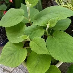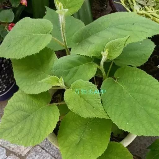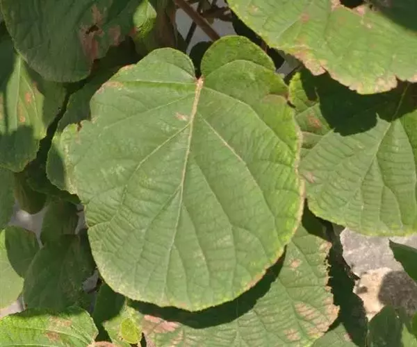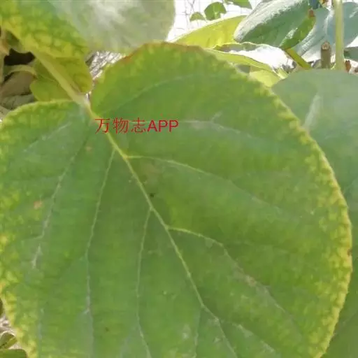 叶为纸质,无托叶,倒阔卵形至倒卵形或阔卵形至近圆形,长6-17厘米,宽7-15厘米,顶端截平形并中间凹入或具突尖、急尖至短渐尖,基部钝圆形、截平形至浅心形,边缘具脉出的直伸的睫状小齿,腹面深绿色,无毛或中脉和侧脉上有少量软毛或散被短糙毛,背面苍绿色,密被灰白色或淡褐色星状绒毛,侧脉5-8对,常在中部以上分歧成叉状,横脉比较发达,易见,网状小脉不易见;叶柄长3-6(-10)厘米,被灰白色茸毛或黄褐色长硬毛或铁锈色硬毛状刺毛。