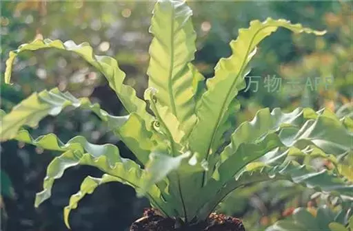 5、肥料:鸟巢蕨特殊的形态和构造,有利于其吸收水分、养分。它的根茎短而密生鳞片,并产生大团海绵状须根,能吸收较多的水分。叶片辐射状着生于根茎顶端,呈鸟巢状或中空的漏斗状,在原生环境中能收集落叶和鸟类及雨水于其巢中,这些物质转化为腐殖质,可作为自己养分来源的一个重要部分。盆栽鸟巢蕨,在其生长旺盛季节,宜每半月浇施一次氮、磷、钾均衡的薄肥,可促使其不断长出大量新叶,如果植株缺肥,叶缘也会变成棕色。夏季气温高于32℃,冬季棚室温度低于15℃,应停止一切形式的追肥。