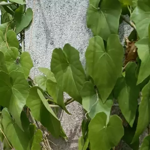 草质藤本。小枝圆柱形,有纵棱纹,常被白粉,无毛。卷须2叉分枝,相隔2节间断与叶对生。叶心状卵圆形,长5-13厘米,宽4-9厘米,顶端急尖或渐尖,基部心形,边缘每侧有9-12个细锐锯齿,上面绿色,下面浅绿色,两面均无毛;基出脉3-5,中脉有侧脉3-4对,网脉不明显;叶柄长2.5-7厘米,无毛;托叶褐色,膜质,肾形,长5-6厘米,宽2-3厘米,无毛。花序顶生或与叶对生,二级分枝4-5集生成伞形;花序梗长1-3厘米,无毛;花梗长2-4毫米,几无毛;花蕾卵圆形,高约4毫米,顶端圆钝;萼杯形,边缘全缘或呈波状,无毛;花瓣4,卵状三角形,高约3毫米,无毛;雄蕊4,花药卵椭圆形,长略甚于宽或长宽近相等;花盘明显,微4裂;子房下部与花盘合生,花柱近钻形,柱头不明显扩大。果实倒卵圆形,长0.8-1.2厘米,宽0.4-0.8厘米,有种子1颗,种子倒卵圆形,顶端圆形,基部有短喙,表面有稀疏突出棱纹,种脐在种子背面下面1/4处与种脊无异,种脊突出,腹部中棱脊突出,向上达种子上部1/3处,侧洼穴呈沟状,达种子上部。花期7-10月,果期11月至翌年5月。