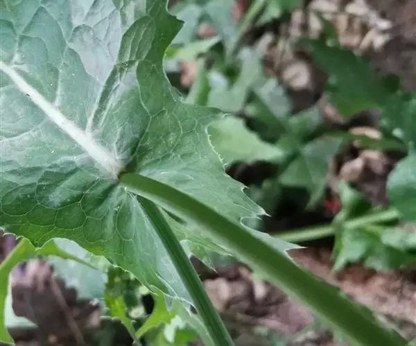 基生叶羽状深裂,全形长椭圆形或倒披针形,或大头羽状深裂,全形倒披针形,或基生叶不裂,椭圆形、椭圆状戟形、三角形、或三角状戟形或圆形,全部基生叶基部渐狭成长或短翼柄;中下部茎叶羽状深裂或大头状羽状深裂,全形椭圆形或倒披针形,长3-12厘米,宽2-7厘米,基部急狭成翼柄,翼狭窄或宽大,向柄基且逐渐加宽,柄基圆耳状抱茎,顶裂片与侧裂片等大或较大或大,宽三角形、戟状宽三角形、卵状心形,侧生裂片1-5对,椭圆形,常下弯,全部裂片顶端急尖或渐尖,下部茎叶或接花序分枝下方的叶与中下部茎叶同型并等样分裂或不分裂而披针形或线状披针形,且顶端长渐尖,下部宽大,基部半抱茎;全部叶或裂片边缘及抱茎小耳边缘有大小不等的急尖锯齿或大锯齿或上部及接花序分枝处的叶,边缘大部全缘或上半部边缘全缘,顶端急尖或渐尖,两面光滑毛,质地薄。