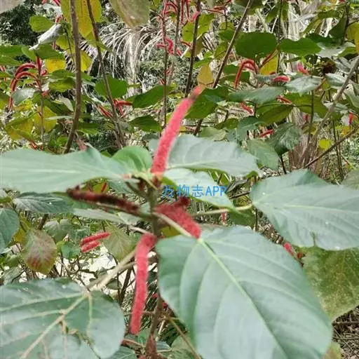 红穗铁苋菜是灌木植物,高0.5-3米;嫩枝被灰色短绒毛,毛逐渐脱落,小枝无毛。叶纸质,阔卵形或卵形,长8-20厘米,宽5-14厘米,顶端渐尖或急尖,基部阔楔形、圆钝或微心形,上面近无毛,下面沿中脉和侧脉具疏毛,边缘具粗锯齿;基出脉3-5条;叶柄长4-8厘米,具短柔毛;托叶狭三角形,长0.6-1厘米,具疏柔毛。
