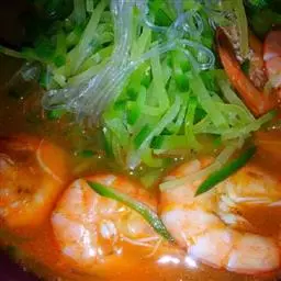 材料:新鲜中虾约500克,蒜蓉2汤匙,红椒半只,葱粒1汤匙,香菜少许,老抽及生抽各1/2汤匙。