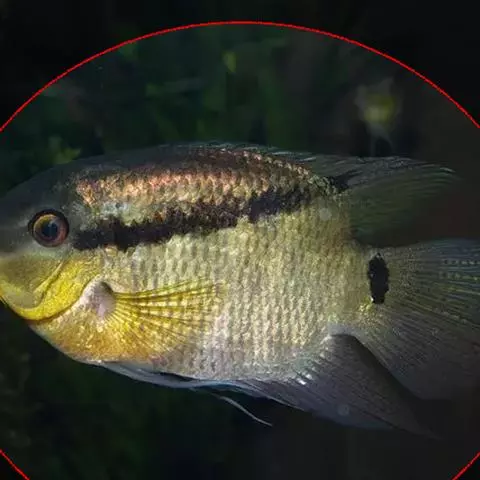 小型慈鲷,成年个体10~12cm,如同鲈鱼一般的典型的鲈形目的体型,体色橙黄,背鳍近边缘处有一条宽约2mm的黑色条纹非常清晰和显眼。雌雄同形,雄性个体稍大。