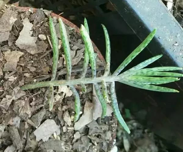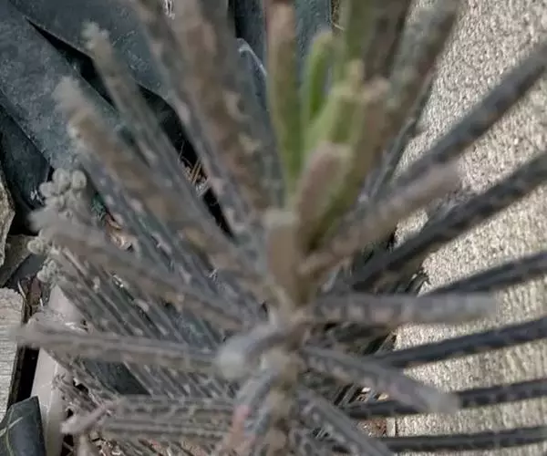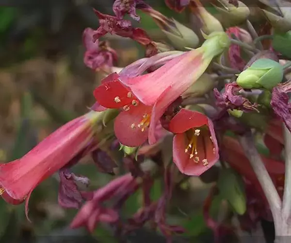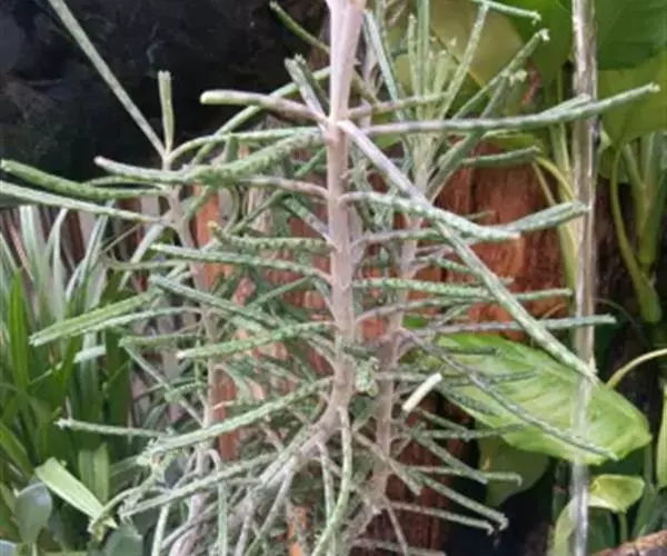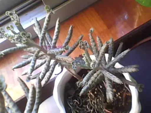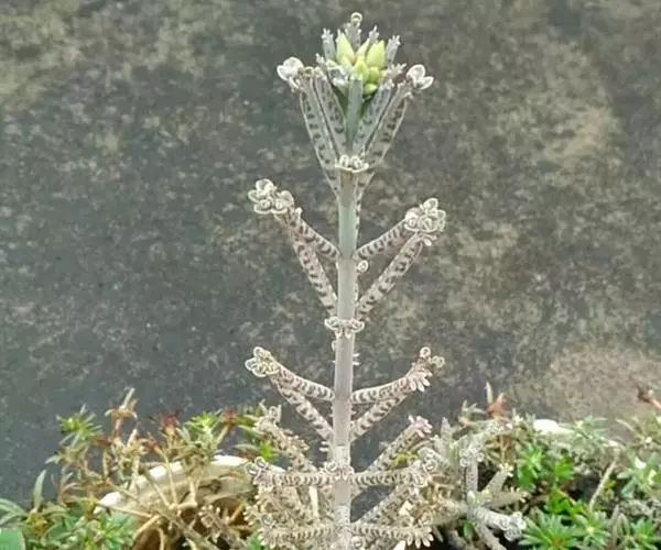 棒叶落地生根,茎直立,粉褐色,高约1m。叶圆棒状,上表面具沟槽,有灰色和黑色的条纹,叶端锯齿上有许多已生根的小植株(由不定芽生成)花序顶生,小花红色。室内盆栽观花类 ,棒叶落地生根适于小型盆栽,供室内观赏。叶端常生具根小植株,十分有趣。