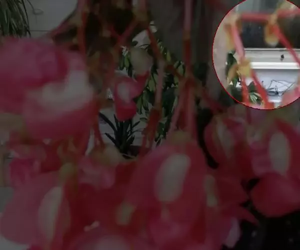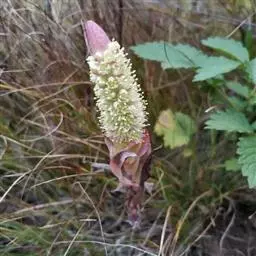 茎直立,粉褐色,成年高约1m,幼年约10cm。叶圆棒状,上表面具沟槽,粉色, 棒叶落地生根 叶端锯齿上有许多已生根的小植株(由不定芽生成)花序顶生,小花红色。