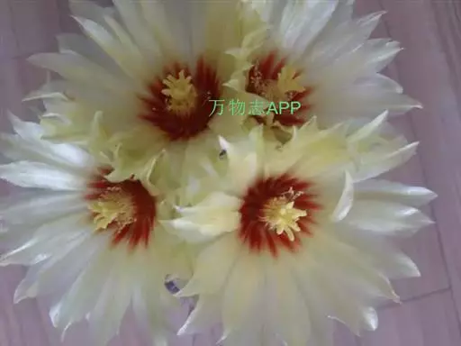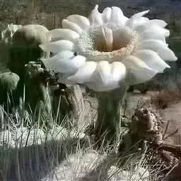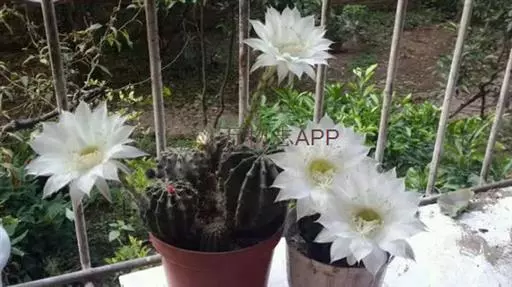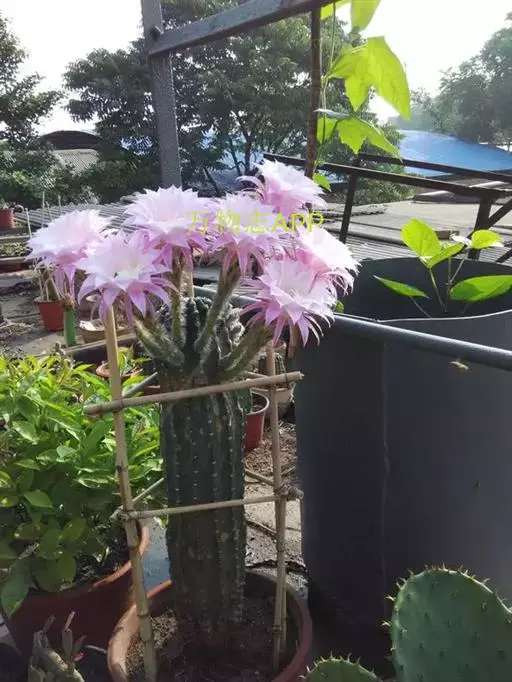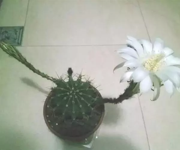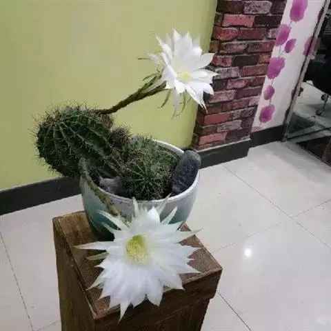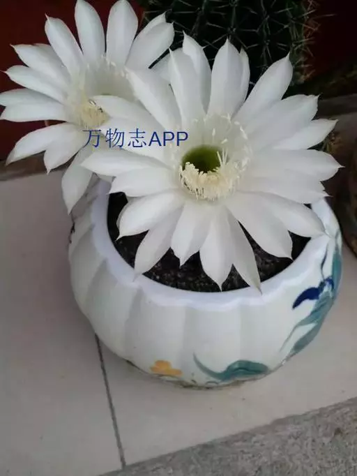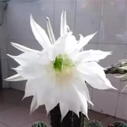 仙人球花(又名花盛球,花盛丸、草球花) 仙人掌科,仙人球属。植株单生或成丛。幼株球形,老株长成圆筒状,高可达75厘米,直径12-15厘米。球体暗绿色,具棱11-12。刺锥状,黑色,长1-1.5厘米。花着生于球体侧方,大型嗽喇叭状,白色。夏季开花。傍晚后开放,翌日清晨即凋谢。原产阿根廷北部及巴西南部的干旱草原,阳光充足,但有草丛遮荫。夏季雨水充沛而冬季干燥。植株强健,喜阳光充足,较耐寒。幼株球形,老株圆筒状,顶端凹入,高约75厘米,径12~15厘米。主球茎基盘萌发籽球。球体暗绿色,具12-14个脊高的棱,棱规则呈波状。棱上刺点单行整齐排列,刺锥状、黑色或茶色,周刺10~15,中刺2~7,稍长,新刺黑褐色,老刺黄褐色。花着生于球体侧方,大型嗽喇叭状,白色(或黄色),具香气,长约24厘米,径约l0厘米,夏季开花。傍晚后开放,翌日清晨即凋谢。一般单花开放时间36小时。是大众化的室内盆花,也是嫁接仙人掌类球形品种的良好砧木。