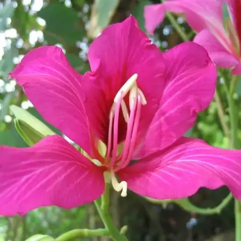 洋紫荆:落叶乔木;树皮暗褐色,近光滑;幼嫩部分常被灰色短柔毛;枝广展,硬而稍呈之字曲折,无毛。叶近…