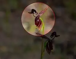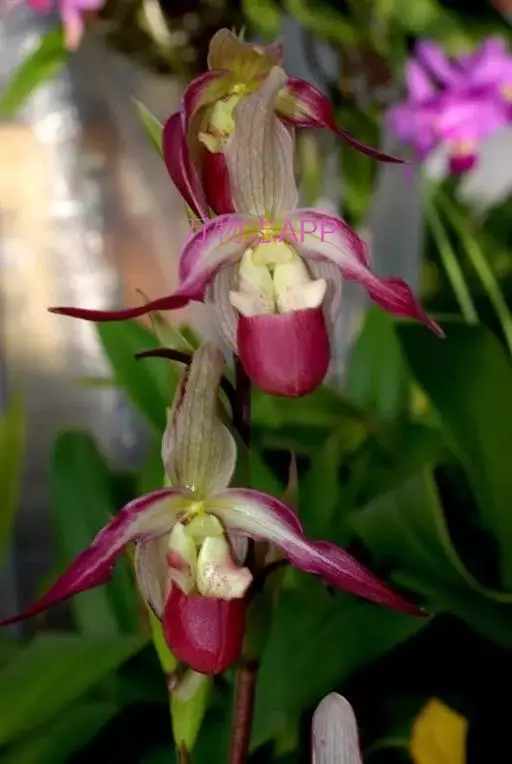 花序顶生,通常具1-2花;花苞片叶状,椭圆状披针形或卵状披针形,长4-6(-10)厘米,宽1.5-4厘米;花梗和子房长约3厘米,具短腺毛;花具栗色或紫红色萼片和花瓣,但唇瓣黄色;中萼片卵形或卵状披针形,长2.5-5厘米,宽8-15毫米,先端渐尖或尾状渐尖,背面中脉疏被短柔毛;合萼片与中萼片相似,先端2浅裂。
