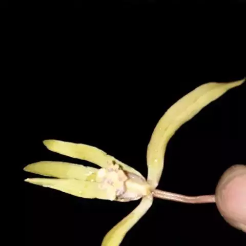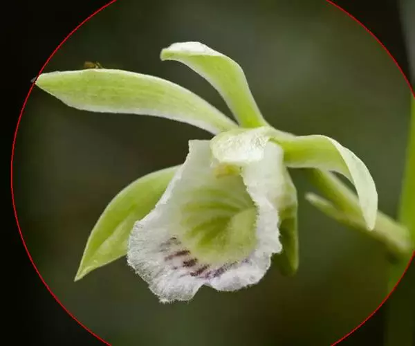 花瓣线形或线状披针形,长3-5厘米,宽4-6毫米,扭转,内表面基部与背面脉上被短柔毛;唇瓣深囊状,椭圆形,长3-4厘米,宽2-3厘米,囊底具毛,囊外无毛;内折侧裂片宽3-4毫米;退化雄蕊近长圆状椭圆形,长7-10毫米,宽5-7毫米,先端钝,基部有长约1毫米的柄,下面有龙骨状突起。花期6-7月。