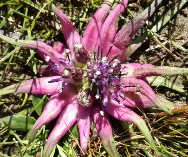 头状花序无小花梗,多数,在莲座状叶丛中密集成半球形的直径为4-6厘米的总花序。总苞圆柱形,直径8-10毫米;总苞片5层,覆瓦状排列,外层长圆形,长9毫米,宽3毫米,顶端圆形,中层狭长圆形,长10毫米,宽5毫米,顶端圆形,内层线形,长1.2厘米,宽3毫米,顶端钝;全部总苞片外面无毛,但中层与外层苞片边缘有睫毛。小花紫色,长1.7厘米,细管部长1.2厘米,檐部长5毫米。瘦果圆柱状,长5毫米,顶端具膜质的冠状边缘。冠毛白色,2层,外层短,糙毛状,长3毫米,内层长,羽毛状,长1.3厘米。花果期7-9月。