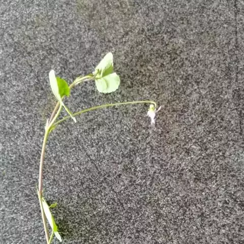 花小,白色或淡紫色,生于茎生叶的叶腋,具细弱的花梗;花梗远长于叶片,中部以上有2枚近于对生的线形小苞片;萼片卵状披针形,长4-5毫米,先端尖,基部附属物短,末端平截具浅齿,边缘狭膜质;上方花瓣长倒卵形,长约9毫米,宽约2毫米,侧方花瓣长圆状倒卵形,长约1厘米,宽约2.5毫米,上部较宽,下部变狭,里面基部有短须毛,下方花瓣连距长约1厘米,先端微凹,下部有深紫色条纹;距呈浅囊状,长1.5-2毫米;雄蕊的花药长约1.7毫米,药隔顶端附属物长约1.5毫米,下方雄蕊的背部具短距;距呈三角形,长约1毫米,粗约1.5毫米,末端钝圆;子房无毛,花柱棍棒状,基部细且明显向前膝曲,向上渐增粗,柱头2裂,裂片稍肥厚而直立,中央部分稍隆起,前方位于2裂片间的基部有斜升的短喙,喙端具圆形的柱头孔。