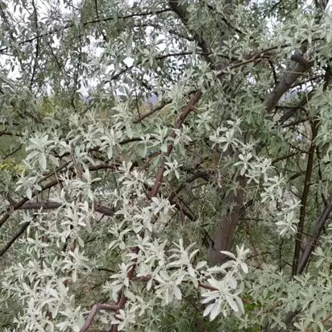 花白色,密集于枝顶成穗状花序,长达15厘米,花序轴常有短毛;萼管卵形,长3毫米,有毛或无毛,萼齿5,圆形,长约1毫米;花瓣5,卵形,长2-3毫米,宽3毫米;雄蕊约长1厘米,常5-8枚成束;花柱线形,比雄蕊略长。