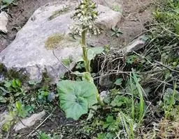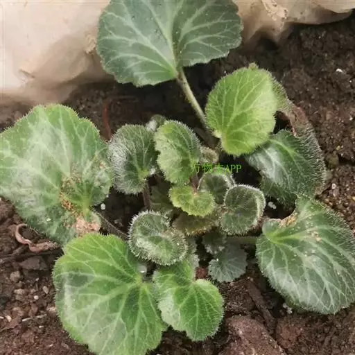 多年生葶状草本。根茎粗壮,直径达1.2厘米。花葶高达70厘米,幼时被密的淡黄色柔毛,后多少脱毛,基部直径5-6毫米,被极密的柔毛。叶全部基生,莲座状,有长柄,柄长15-25厘米,幼时被与花葶上一样的毛,后多脱毛,基部扩大,呈短鞘,抱茎,鞘内被密毛,叶片肾形,长9-13厘米,宽11-22厘米,先端圆形,全缘或有小齿至掌状浅裂,基部弯缺宽,长为叶片的1/3,叶质厚,近革质,两面幼时被灰色柔毛,后脱毛,上面绿色,下面淡绿色;茎生叶1-3,苞叶状,长圆形或线状披针形,长1-2厘米。
