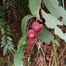 雄花:1-2朵腋生,或几朵与雌花簇生于叶腋,直径2-10毫米;花梗纤细,长5-7.5毫米;花盘浅盘状,直径5-12毫米,6浅裂,裂片倒卵形,覆瓦状排列,无退化雌蕊;雄花3,花丝合生呈短柱状,花药外向,2室,纵裂;花盘腺体6,与萼片对生,上部向内弯而将花药包围;雌花:通常单生于叶腋;花梗长6-8毫米;花萼6深裂,裂片红色,倒卵形或倒卵状三角形,长5-6毫米,宽3-5.5毫米,顶端钝或圆,基部渐狭而成短爪,覆瓦状排列;无花盘;雌蕊扁球状,直径约1.5毫米,高约0.7毫米,子房3室,每室2颗胚珠,花柱3,顶端2裂。蒴果扁球状或圆球状,直径约1.7厘米,高1.2厘米,乳白色,宿存花萼红色;果梗长5-10毫米;种子三棱状,长约7毫米,宽约5毫米,黑色。花期4-7月,果期7-12月。