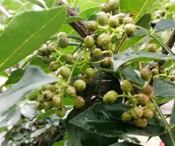(四)采收注意事项:一是保护枝组,花椒最大的特点是结果枝连续结果的能力很强,中长果枝基本在果枝的顶端,采收时若用剪刀剪花穗很容易剪掉花穗总轴,影响再抽生新的花穗。正确的做法是:一手拿住果枝,一手从果枝基部掐取果穗,尽量保持花穗总轴。二是保护叶片,花椒采收后叶片制造的养份全部转向营养积累,摘椒后至越冬前(10月底)这段时间尽可能保持叶片完整,浓绿茂盛,增强光合作用,多积累养分。