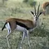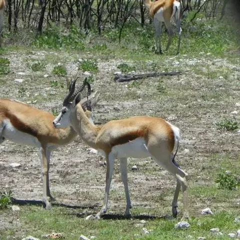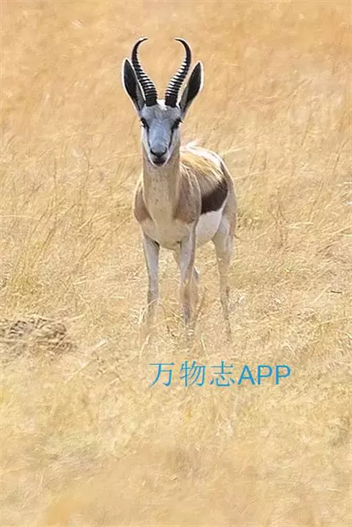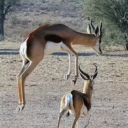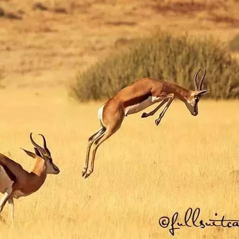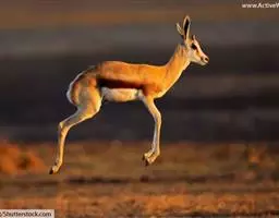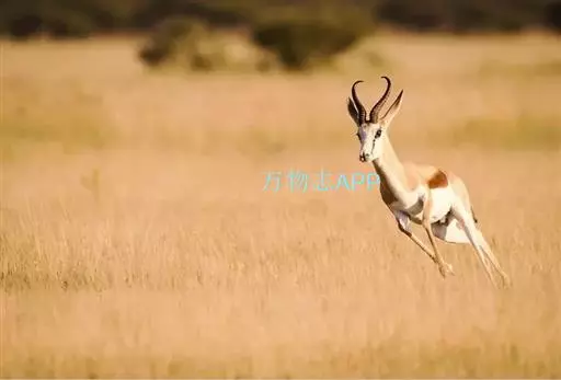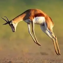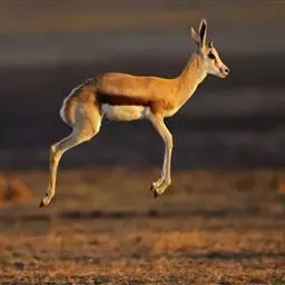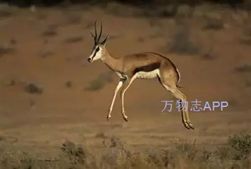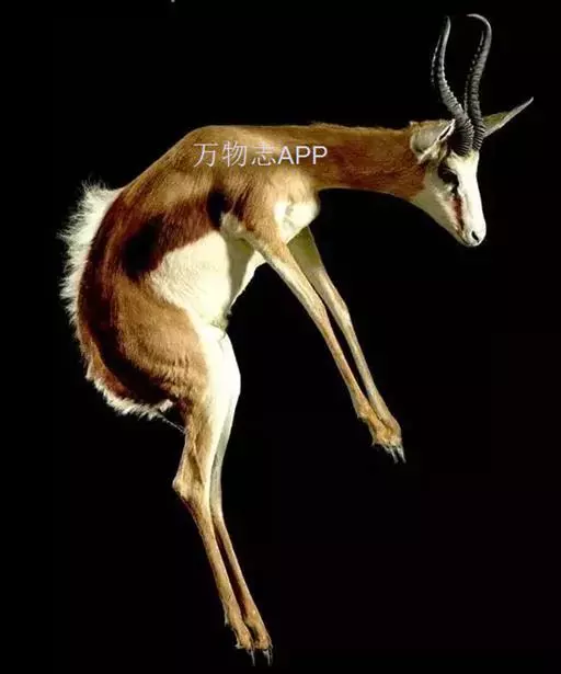 跳羚(学名:Antidorcas marsupialis):体长1.2-1.5米,肩高68-90厘米,体重37-50千克;四肢细长;背部中央有1条纵向的由皮肤下凹而形成的褶皱,褶皱内的毛为白色,当受惊而开始逃跑时,褶皱展开,出现1条明显的白脊,这是向同伴告警的信号;雌雄均具角,黑色上具环棱。极善跳跃,跳起时脊背弓起,四肢下伸而靠拢,一跃可高达3-3.5米,故名。