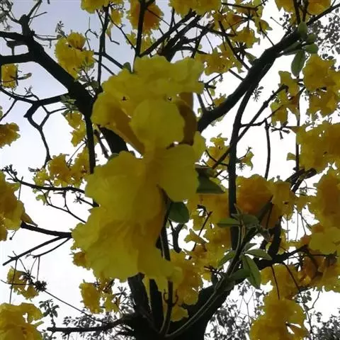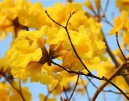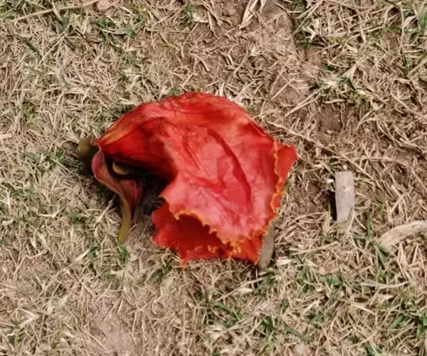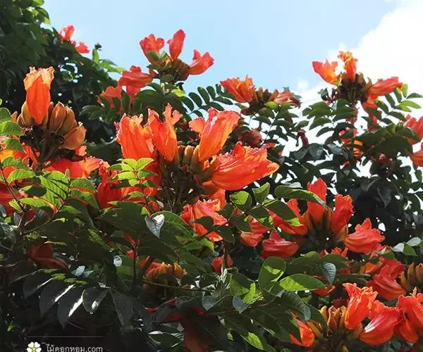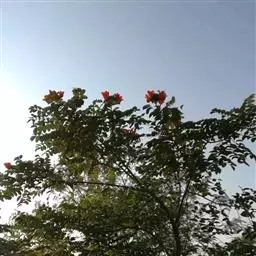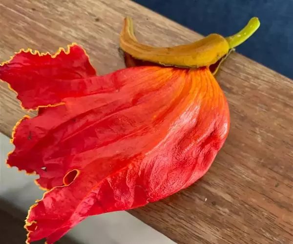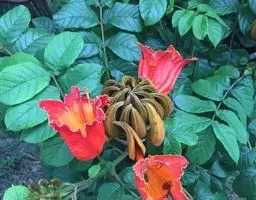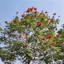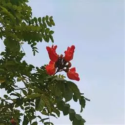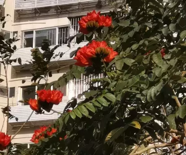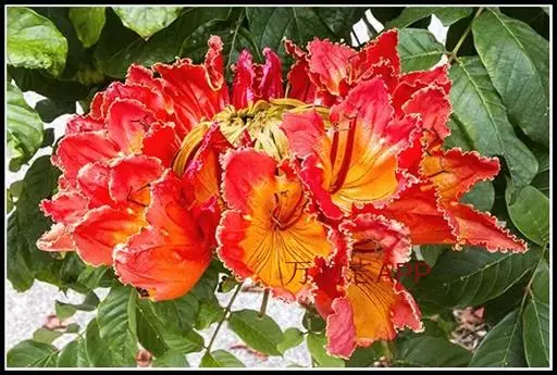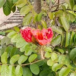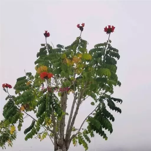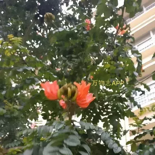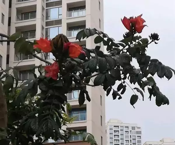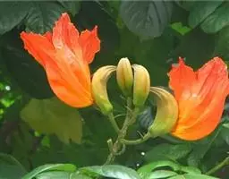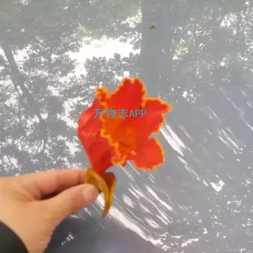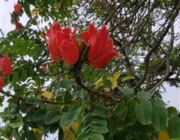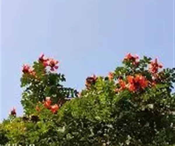火焰树(Spathodea campanulata Beauv.)别名火烧花、喷泉树、苞萼木、火焰木,是加蓬共和国的国树。为紫葳科落叶大乔木,又名苞萼木,原产非洲,花期冬春之间,花朵杯形硕大,树高约10米,长约10-12厘米,冠幅较大,常作荫庇树或行道树,也适宜公园、社区、旅游区等地种植。细细观之,深红色的花瓣边缘有一圈金黄色的花纹,异常绚丽。