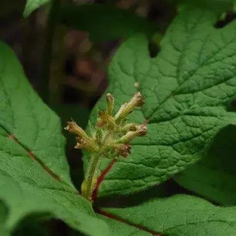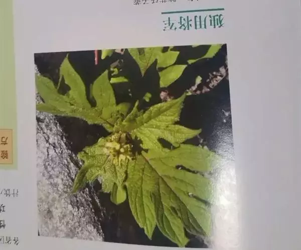 图版24: 4-6 叶羽状深裂,基部楔形至宽楔形,近无柄,轮廓倒卵形至倒卵状椭圆形,长8-20厘米,宽6-18厘米,裂片1-3对,无锯齿,顶端渐尖,上面浅绿色,散生刚毛,沿脉及边缘毛较密,背面黄白色;茎基部的初生叶有时不分裂。聚伞花序对生,各具3朵花,无总花梗,有时花序下具卵全缘的苞片,在茎或分枝顶端集合成短穗状花序;萼筒被刚毛和腺毛,萼裂片三角形,长3毫米;花冠黄绿色,狭钟状,长1厘米,筒基部弯曲,一侧膨大成浅囊,被腺毛,裂片圆而短,内面有带紫色斑点;雄蕊着生于花冠筒中部以下,花丝短,花药矩圆形,花柱基部被长柔毛,柱头楔状头形。果癸卵圆,肉质,具3条槽,长10毫米,冠以宿存的萼齿;核3枚,扁,亮黑色。种子凸平,腹面具2条槽。花期5-6月,果期8-9月。