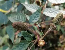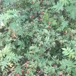 矮灌木,高约1米,枝条广开,有细刺;小枝粗糙,圆柱形,幼时具绒毛,紫红色,二年生枝条有疣状突起,黑褐色,无毛;冬芽三角卵形,先端急尖,无毛,紫褐色。叶片倒卵形、匙形至宽卵形,长3-5厘米,宽2-3厘米,先端圆钝,稀微有急尖,基部楔形或宽楔形,边缘有圆钝锯齿,齿尖向内合拢,无毛;叶柄长约5毫米,无毛;托叶肾形有圆齿,长1厘米,宽1.5-2厘米。