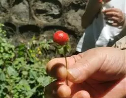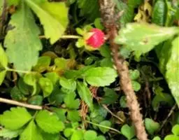 花3-5朵簇生,花梗短或近于无梗,无毛;花直径2.5-4厘米;萼筒钟状,外面无毛;萼片卵形,稀半圆形,长4-5毫米,比萼筒约短一半,先端急尖或圆钝,边缘有不显明锯齿,外面无毛,内面基部有褐色短柔毛和睫毛;花瓣倒卵形或近圆形,基部延伸成短爪,长约2厘米,宽约1.5厘米,砖红色;雄蕊40-60,长约花瓣之半;花柱5,基部合生,无毛,柱头头状,有不显明分裂,约与雄蕊等长。果实近球形,直径3-4毫米,黄色,萼片脱落。花期3-6月,果期8-10月。