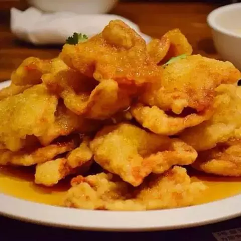 2、炒锅放在旺火上,下猪油烧到八成热时,把挂匀湿淀粉的肉片、荸荠下锅翻炸二分钟,待肉片出现荔枝形状时,倒入漏勺沥去油。炒锅留余油放在旺火上,先下蒜米煸炒,再下葱段、白糖、香醋、酱油、骨汤、芝麻油和湿淀粉(5克)调稀勾芡,倒进荔枝肉、荸荠,加入猪油15克,翻炒几下,装在盘中即成。