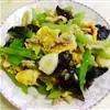 4.锅中放入橄榄油,煸炒青红椒,放汤一勺,加糖和剩下的盐调味。