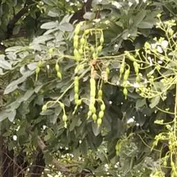 槐为落叶乔木,高8-20m。树皮灰棕色,具不规则纵裂, 槐花 内皮鲜黄色,具臭味;嫩枝暗绿褐色,近光滑或有短细毛,皮孔明显。奇数现状复叶,互生,长15-25cm,叶轴有毛,基部膨大;小叶7-15,柄长约2mm,密生白色短柔毛;托叶镰刀状,早落;小叶片卵状长圆形,长2.5-7.5cm,宽1.5-3cm,先端渐尖具细突尖,基部宽楔形,全缘,上面绿色,微亮,背面优生白色短毛。圆锥花序顶生,长15-30cm;萼钟状,5浅裂;花冠蝶形,乳白色,旗瓣阔心形,有短爪,脉微紫,翼瓣和龙骨瓣均为长方形;雄蕊10,分离,不等长;于房筒状,有细长毛,花柱弯曲。荚果肉质,串珠状,长2.5-5cm,黄绿色,无毛,不开裂,种子间极细缩。种子1-6颗,肾形,深棕色。花期4-5月,果期10-11月。