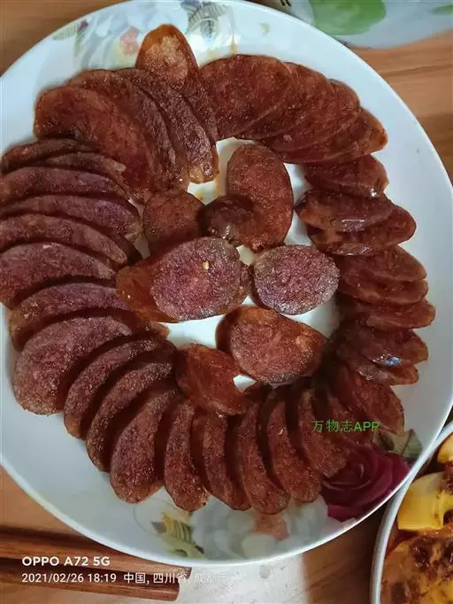 优质香肠色泽红艳,间有白色夹花,滋味咸口带甜,细品时芳香浓郁。