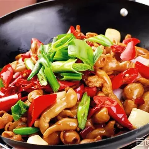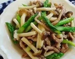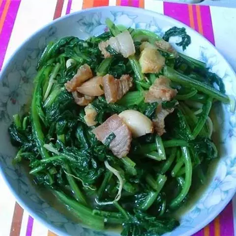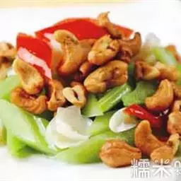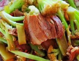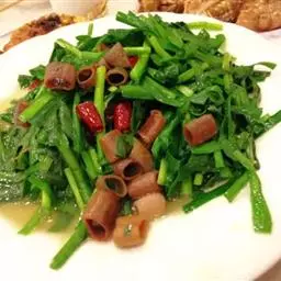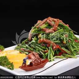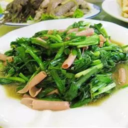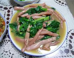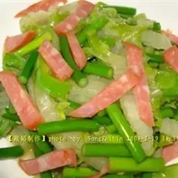 原料:鲜芥兰150克、香肠100克、生姜10克。花生油150克、盐10克、味精8克、白糖2克、湿生粉适量、麻油少许。