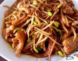 然后调入味精、白糖炒匀,用湿生粉打芡,淋入麻油翻炒几下出锅即可。