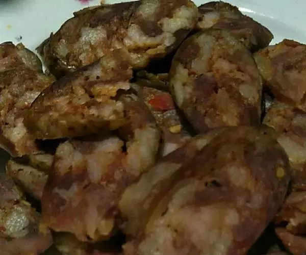 做好的香肠挂在阴凉处,避免阳光直射,让其自然风干,用松柏枝烟熏,然后蒸食或者煮食,或者切片炒菜均可。