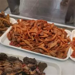 皮肠:盐、干肠衣先用温水浸泡15分钟左右,软化后内外冲洗一遍,另用清水浸泡备用,泡发时水温不可过高,以免影响肠衣强度。将肠衣从一端开始套在漏斗口(或皮肠机管口)上,套到末端时,放净空气,结扎好,然后将肉丁灌入,边灌填肉丁边从口上放出肠衣,待充填满整根肠衣后扎好端口,最后按15厘米左右长度翅结,分成小段。