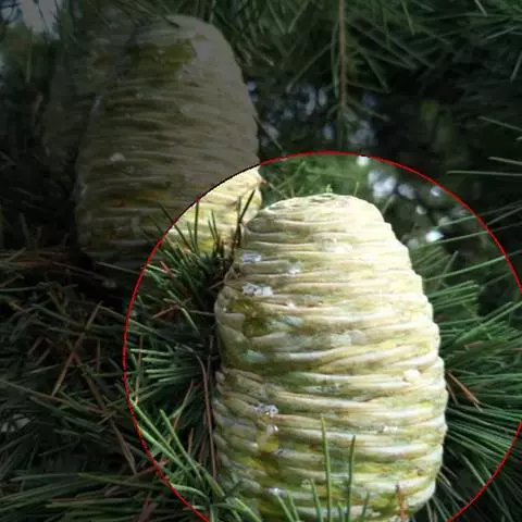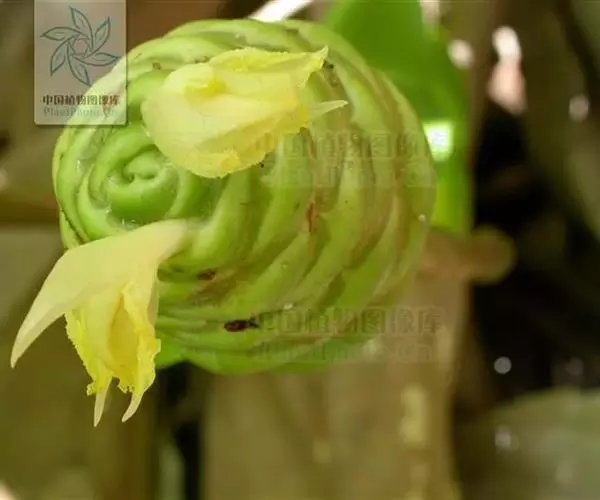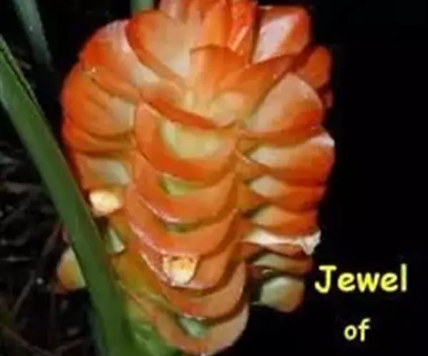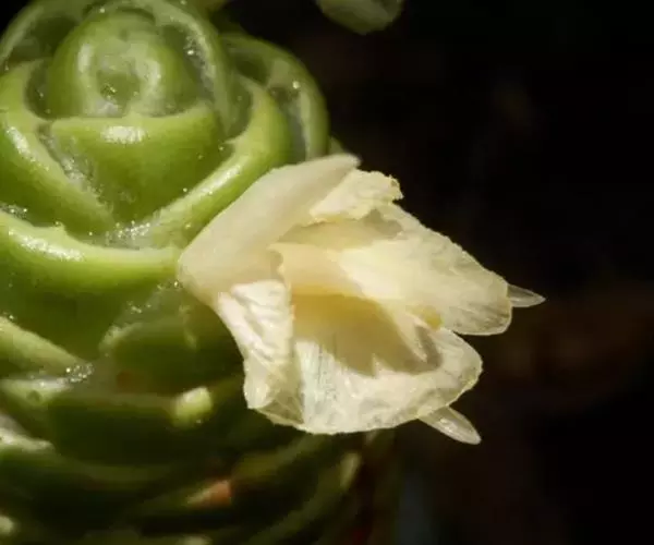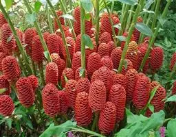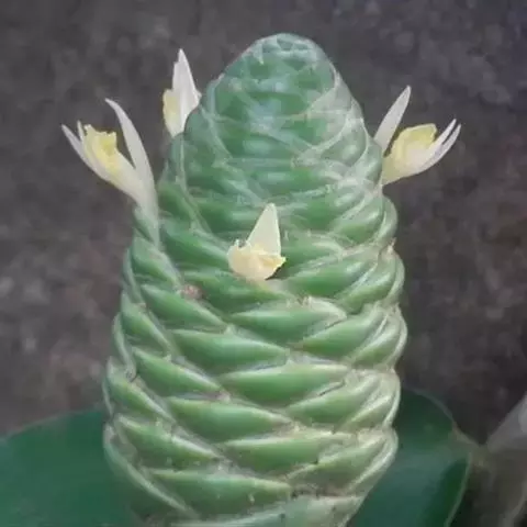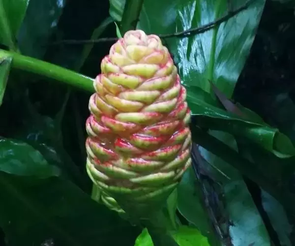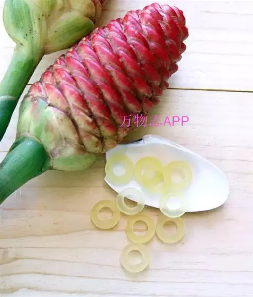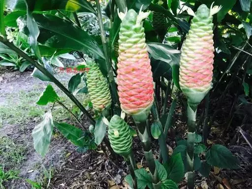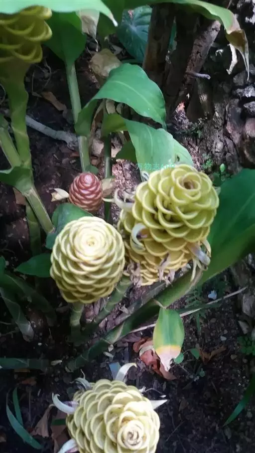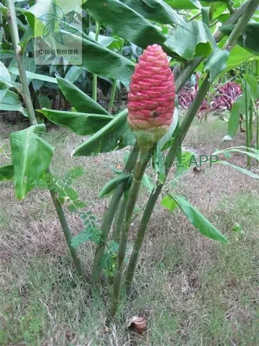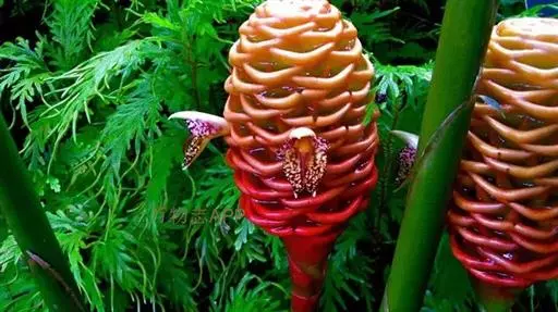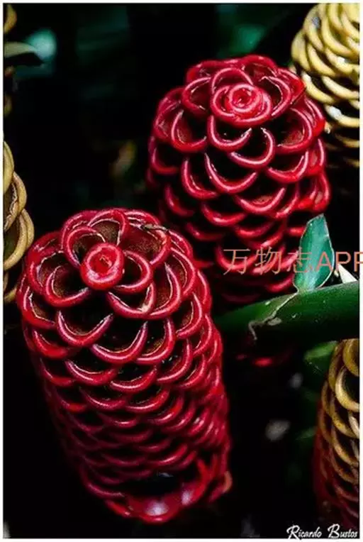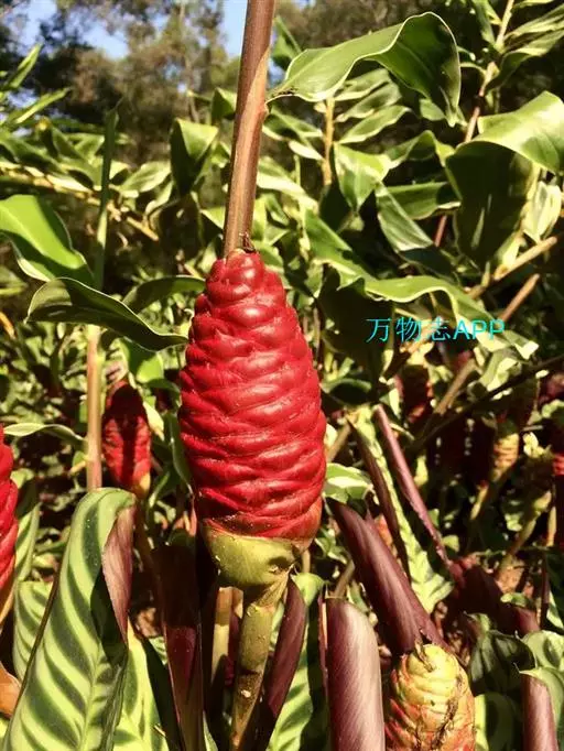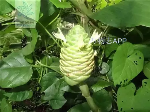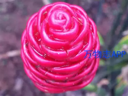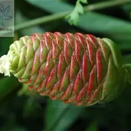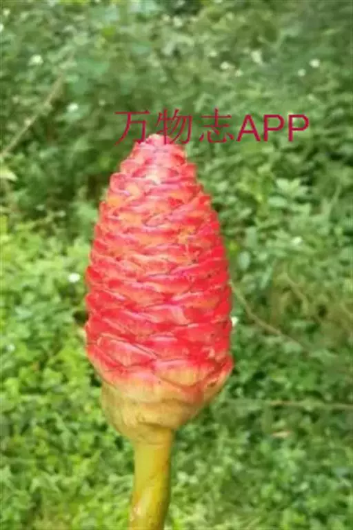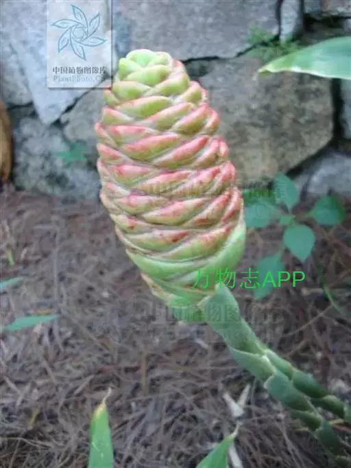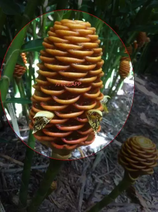穗状花序着生于花茎顶端,近长圆形,松果状。苞片密集,覆瓦状排列,幼时绿色,后转红色。小花具细长花冠筒,檐部3裂,白色。花期夏、秋季。总花梗长10-30厘米,被5-7枚鳞片状鞘;花序球果状,顶端钝,长6-15厘米,宽3.5-5厘米;苞片覆瓦状排列,紧密,近圆形,长2-3.5厘米,初时淡绿色,后变红色,边缘膜质,被小柔毛,内常贮有粘液;花萼长1.2-2厘米,膜质,一侧开裂;花冠管长2-3厘米,纤细,裂片披针形,淡黄色,后方的一枚长,长1.5-2.5厘米;唇瓣淡黄色,中央裂片近圆形或近倒卵形,长1.5-2厘米,宽约1.5厘米,顶端2裂,侧裂片倒卵形,长约1 厘米;雄蕊长1厘米,药隔附属体喙状,长8毫米。蒴果椭圆形,长8-12毫米;种子黑色。花期:7-9月,果期:10月。 [3-5]