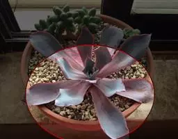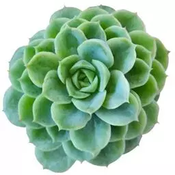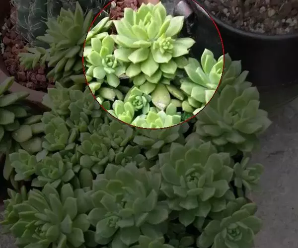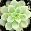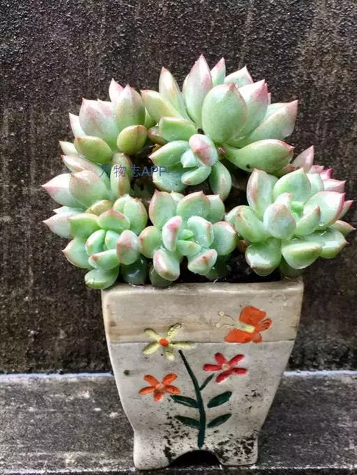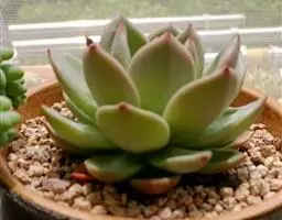 女雏茎部不太粗壮,会随着时间的生长而逐渐群生。叶片莲座型密集排列。叶片肥厚长勺形,叶色翠绿至粉红,新叶色浅、老叶色深。强光与昼夜温差大或冬季低温期叶色深,叶缘微粉红。弱光则叶色浅绿。叶缘在秋季温差大常会显现粉红色。叶面上覆有微白粉,老叶白粉掉落後呈光滑状。