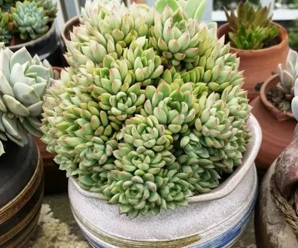大和锦是景天科拟石莲花属的多肉植物。肉质叶排成紧密的莲座状,广卵形至散三角卵形,背面突起呈龙骨状,…