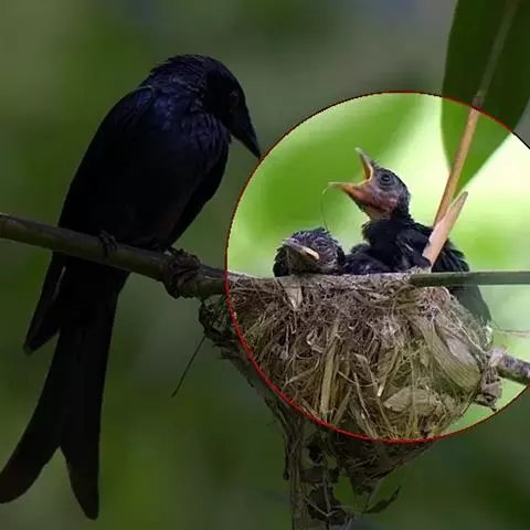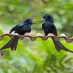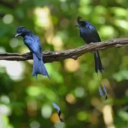 发冠卷尾是中型鸟类,体长28-35厘米。通体绒黑色缀蓝绿色金属光泽,额部具发丝状羽冠,…