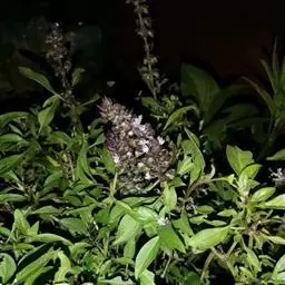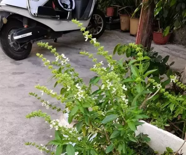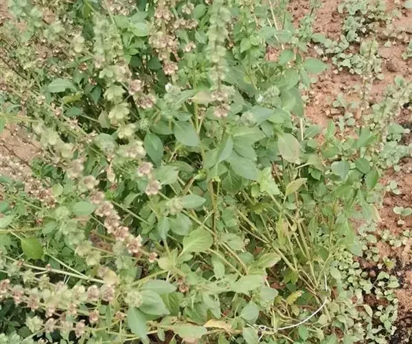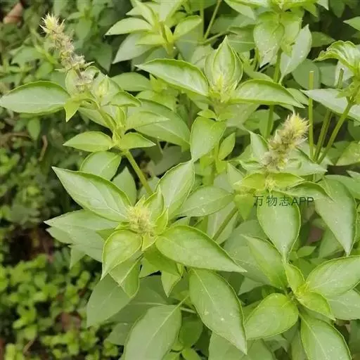 圣罗勒(O.cimum sanctum),基部木质化,花白色或粉红色,叶片上有毛,叶缘有齿,具香辣味。