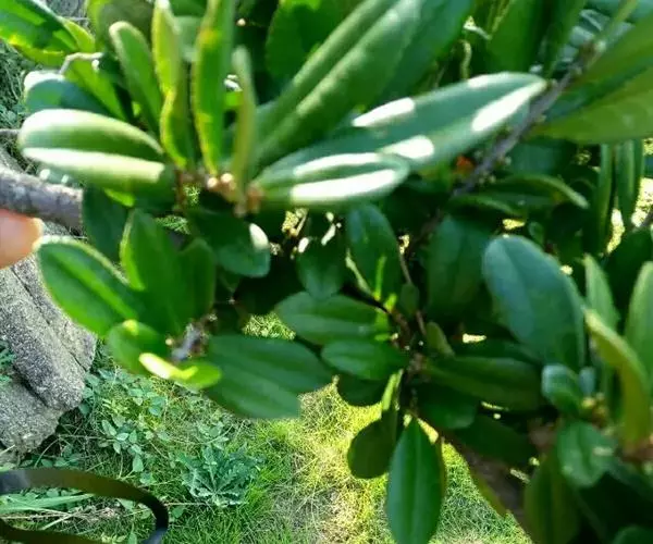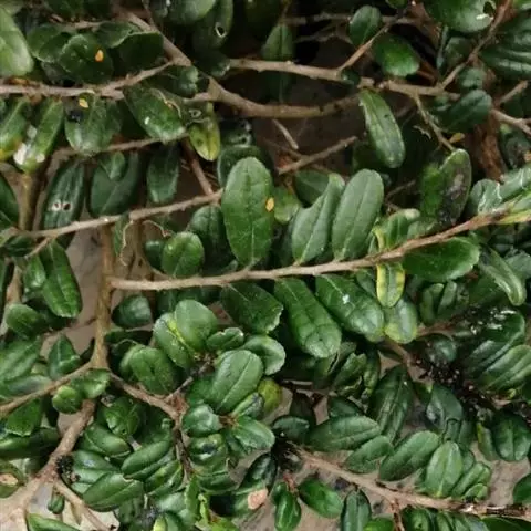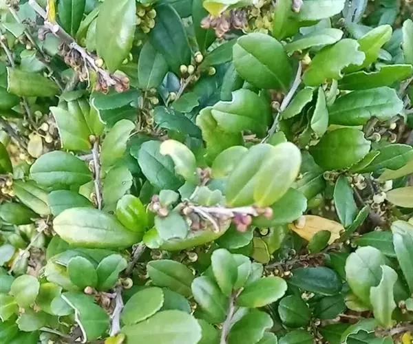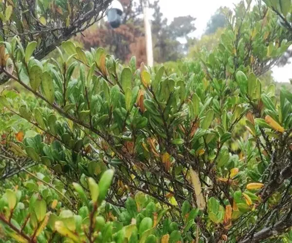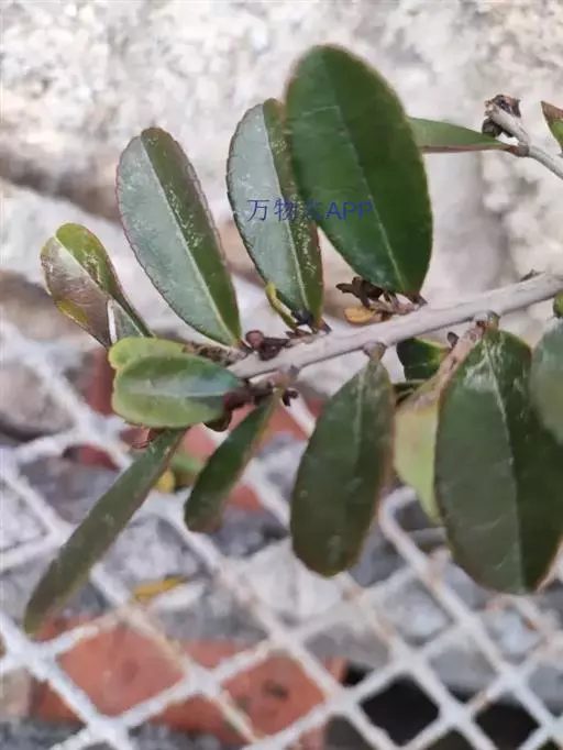 灌木,高1-2米;嫩枝圆柱形,极稀稍具棱,粗壮,红棕色,密被黄褐色短柔毛,小枝灰褐色或红褐色,无毛或几无毛;顶芽长锥形,被短柔毛或几无毛。叶厚革质,倒卵形或倒卵状披针形,长2-3厘米,宽1.2-1.8厘米,顶端圆而有微凹,基部楔形,边缘有细微锯齿,齿端具黑色小点,稍反卷,上面绿色或深绿色,稍有光泽,下面黄绿色或淡绿色,两面均无毛,中脉在上面凹下,下面隆起,侧脉约5对,纤细,连同网脉在上面凹下,下面稍隆起;叶柄长2-3毫米,无毛。