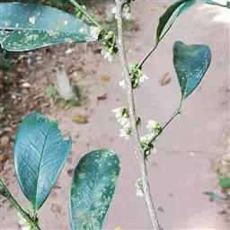 花1-2朵生于叶腋,花梗长约2毫米。雄花:小苞片2,近圆形;萼片5,质稍厚,几圆形,长1-1.5毫米,顶端圆而有小尖头,无毛;花瓣5,白色,长圆形或长圆状倒卵形,长约3.5毫米;雄蕊约20枚,花药具分格,退化子房无毛。雌花的小苞片和萼片与雄花同;花瓣5,卵形,长约3毫米;子房圆球形,3室,无毛,花柱长约1毫米,顶端3裂。果实圆球形,直径3-4毫米,成熟时黑色。花期10-11月,果期次年6-8月 。