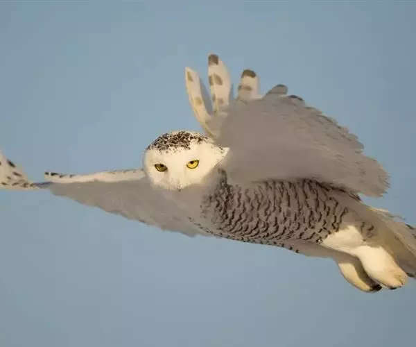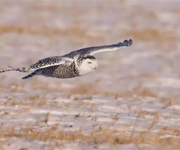 雄性幼鸟的颈部、颈后和尾羽都比雌性幼鸟白。雄性雪鸮随着年龄的增长会越来越白,部分年老的雪鸮全身会接近纯白色,而雌性雪鸮身上的一些斑点终身不消失。雪鸮的羽毛非常浓密,这些浓密的羽毛使它们能在气温零下50℃的环境下还能保持38-40℃的体温。因此,如果它们遇到强风,就会找到石堆、雪堆或是干草堆作为避风处,然后蜷缩身体贴在地面上,这样它们浓密的羽衣就能为它们御寒。它们雪白的羽毛在冬季是非常好的伪装。