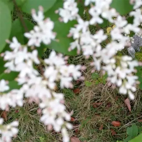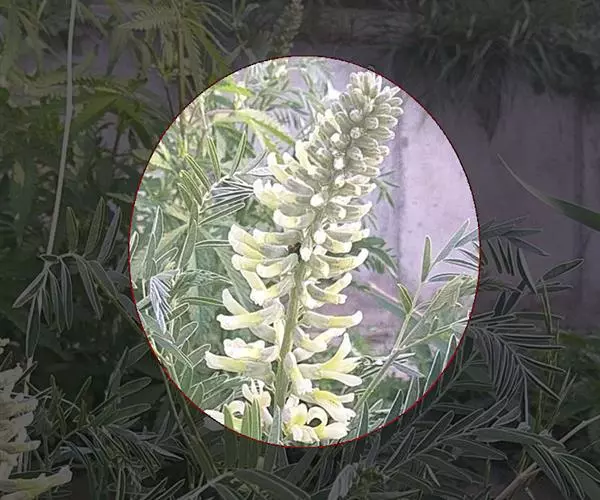 总状花序顶生;花多数,密生;花梗长3-5毫米;苞片似托叶,脱落;花萼斜钟状,5萼齿明显,不等大,三角状卵形;花冠白色或淡黄色,旗瓣形状多变,通常为长圆状倒披针形,长15-20毫米,宽3-4毫米,先端圆或微缺,或明显呈倒心形,基部渐狭或骤狭成柄,翼瓣常单侧生,稀近双侧生,长约16毫米,卵状长圆形,具三角形耳,皱褶明显,龙骨瓣与翼瓣相似,先端明显具突尖,背部明显呈龙骨状盖叠,柄纤细,长约为瓣片的二分之一,具1三角形耳,下垂;雄蕊10,花丝不同程度连合,有时近两体雄蕊,连合部分疏被极短毛,子房密被白色近贴伏柔毛,柱头圆点状,被稀少柔毛。