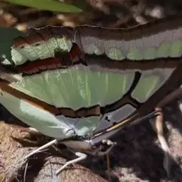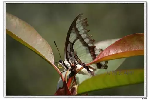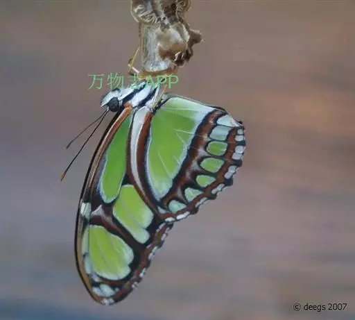 二尾蛱蝶的悬蛹外形就好象一个挂在枝条上的果实,再加上翠绿色的外表,以保护自己不受天敌伤害。