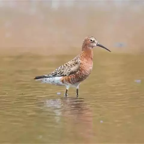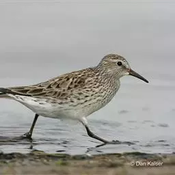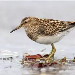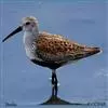 黑腹滨鹬(学名:Calidris alpina)是鹬科滨鹬属鸟类。小型涉禽,体长16-22厘米。嘴黑色、较长,尖端微向下弯曲,脚黑色。 夏季背栗红色具黑色中央斑和白色羽缘。眉纹白色。下体白色,颊至胸有黑褐色细纵纹。腹中央黑色,呈大型黑斑。冬羽上体灰褐色,下体白色,胸侧缀灰褐色。飞翔时翅上有显著的白色翅带,腰和尾黑色,腰和尾的两侧为白色,野外特征甚明显。特别是夏羽,仅通过腹部大型黑斑和栗红色的背,就很容易的与其他鹬类相区别。但冬羽和弯嘴滨鹬、阔嘴鹬非常相似,野外鉴别较困难。不过弯嘴滨鹬嘴较长而细,向下弯曲弧庋较大,脚亦较长,腰白色, 两侧不为黑色;阔嘴鹬体形较小,脚亦较短,具双道白色眉纹,野外容易区别。