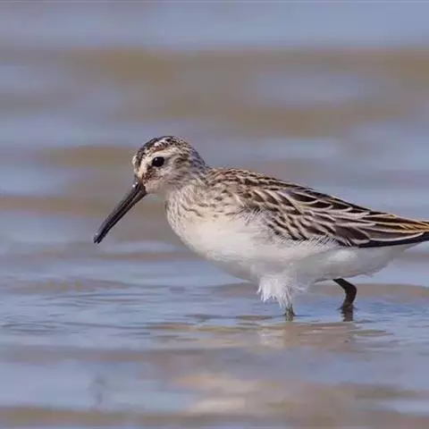 阔嘴鹬是涉禽,体长17厘米。特征为翼角常具明显的黑色块斑并具双眉纹。与黑腹滨鹬平滑下弯的嘴相比,…