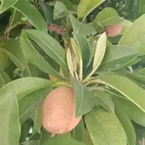 人心果(学名:Manilkara zapota (Linn.) van Royen),乔木,高15-20米,小枝茶褐色,具明显的叶痕。叶互生,密聚于枝顶,革质,长圆形或卵状椭圆形;叶柄长1.5-3厘米。花1-2朵生于枝顶叶腋;花梗长2-2.5厘米,密被黄褐色或锈色绒毛;花萼外轮3裂片长圆状卵形;花冠白色,先端具不规则的细齿;能育雄蕊着生于冠管的喉部,花丝丝状,花药长卵形;退化雄蕊花瓣状;子房圆锥形;花柱圆柱形,基部略加粗。浆果纺锤形、卵形或球形;种子扁。花果期4-9月。